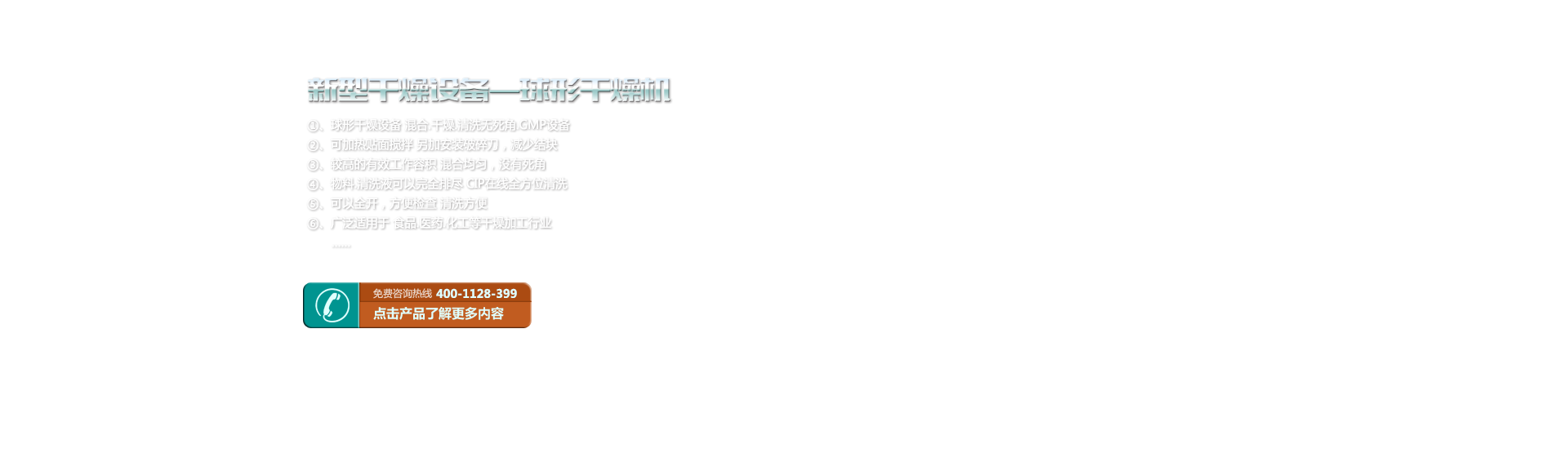 球形干燥設(shè)備 混合.干燥.清洗無死角.GMP設(shè)備 可加熱貼面攪拌 另加安裝破碎刀,減少結(jié)塊 較高的有效工作容積 混合均勻,沒有死角 物料.清洗液可以完全排盡 CIP在線全方位清洗 可以全開,方便檢查 清洗方便 廣泛適用于 食品.醫(yī)藥.化工 等干燥加工行業(yè) 設(shè)備模擬流程 設(shè)備選型 技術(shù)參數(shù) HCQG球形干燥機(jī)